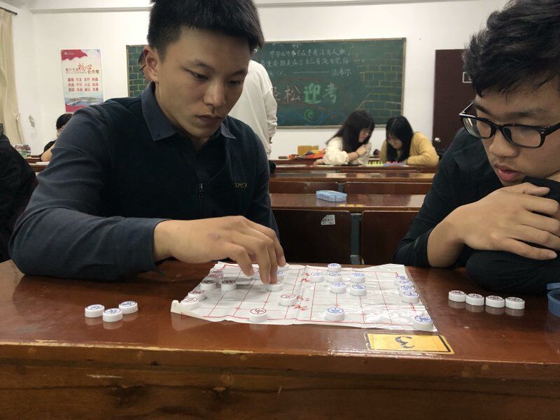棋弈对阵,智谋比拼,楚河汉界,花落谁家。选手们从比赛一开始,就投入了这场思维战中,每张桌子都成了战场,你争我夺,一时间棋盘上纵横交错,战火熊熊,选手们你堵我截,或雷厉风行,或精雕细琢, 甚是精彩。围观的同学不少, 但大家都深谙 “观棋不语” 的道理, 在参赛者旁边站着,保持着安静,共享竞技的快乐。