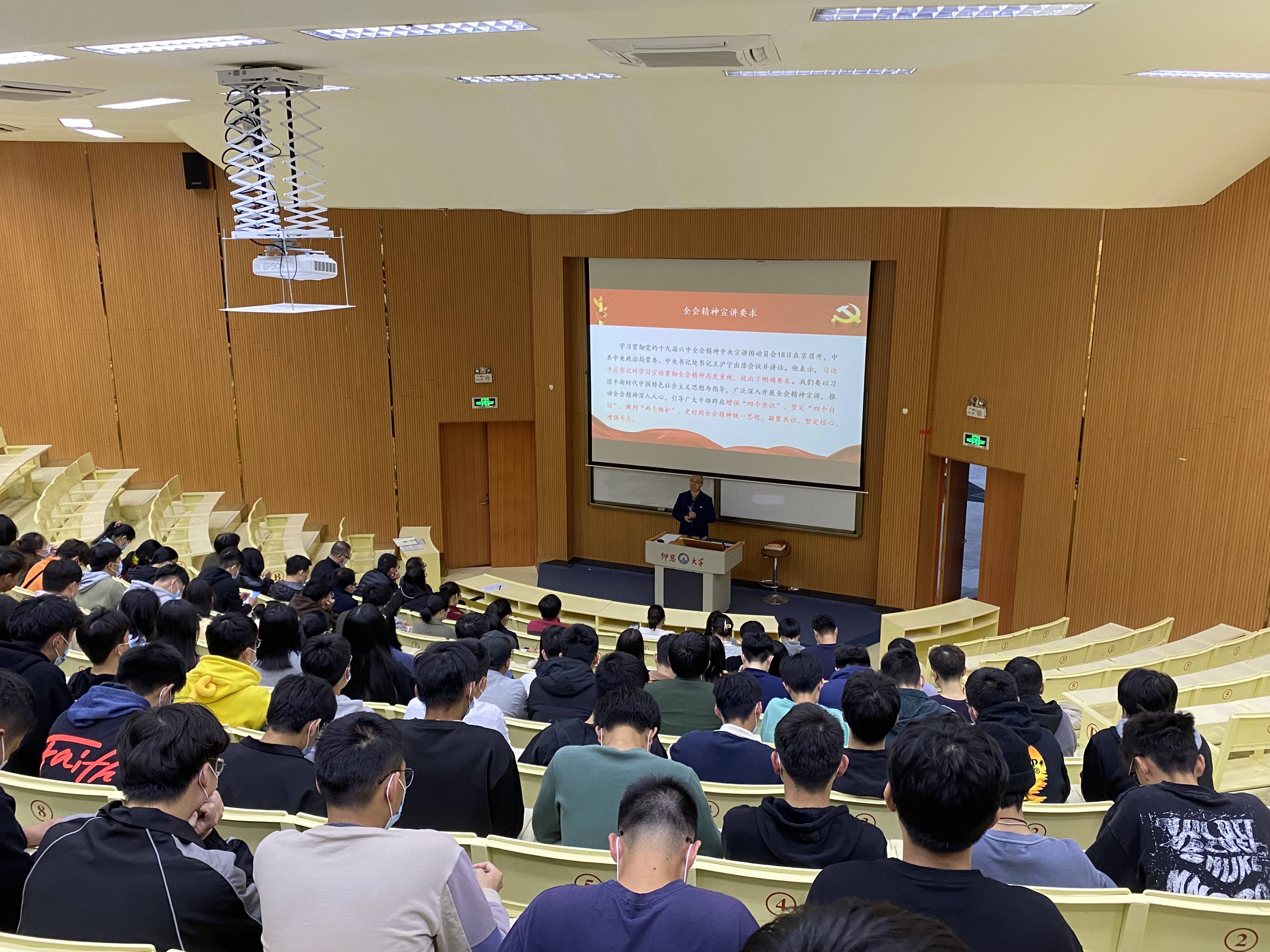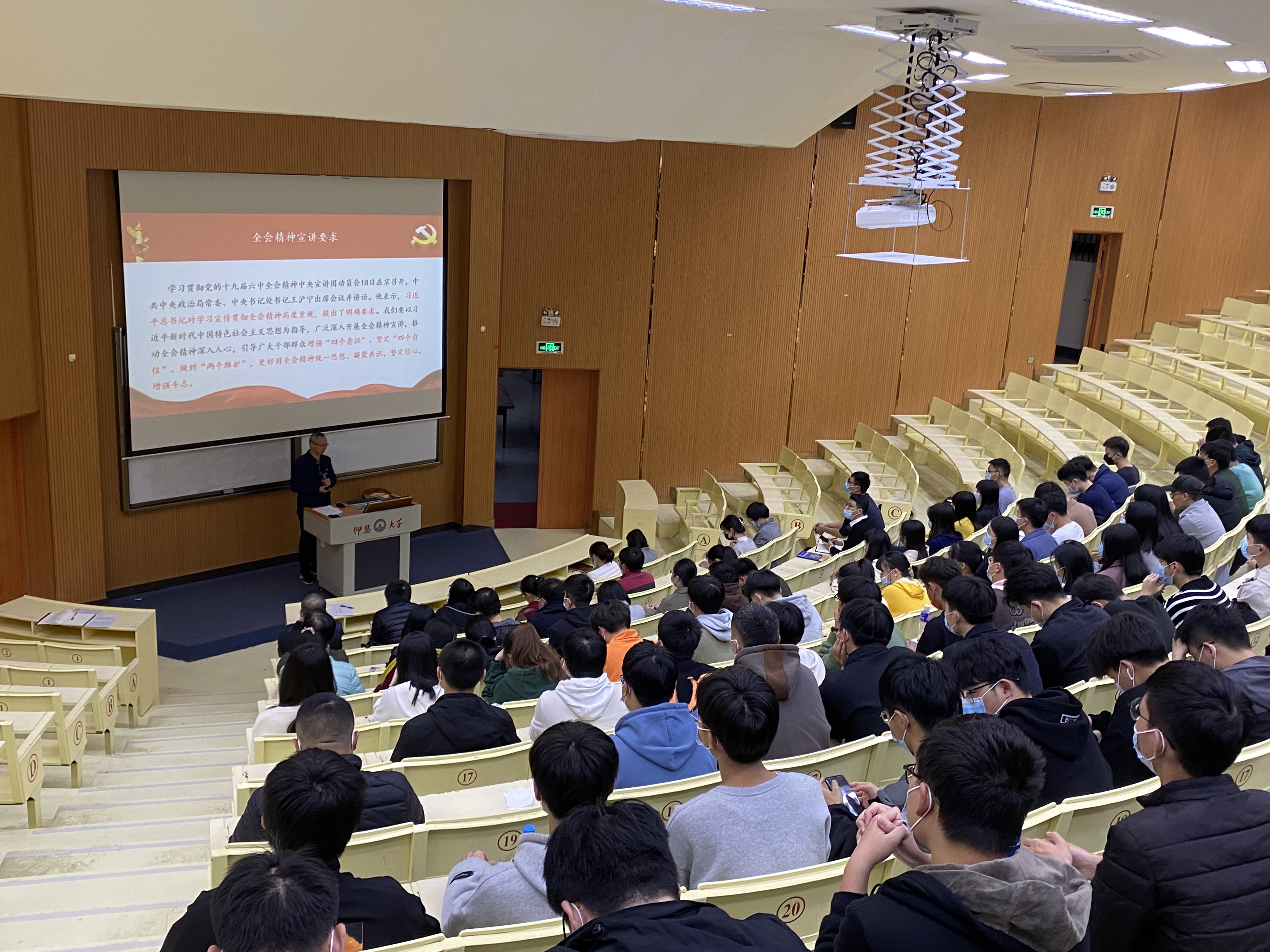 首先,胡友仁老师以“六中全会的议程、重大成就和重大意义”作为开篇,引导在座的老师和同学们要增强“四个意识”、坚定“四个自信”、拥护“两个确立”,更好用全会精神统一思想、凝聚共识、坚定信心、增强斗志。同时,胡老师在《历史决议》的主要内容和重大创新等方面做了更为深入的讲解,博得在场老师和同学们的阵阵掌声。最后,胡老师希望在场的各位党员同志能够通过本次的主题讲座,认真学习全面贯彻落实十九届六中全会精神,切实拥护“两个确立”,坚持系统观念,统筹推进“五位一体”总体布局,协调推进“四个全面”战略布局,立足新发展阶段、贯彻新发展理念、构建新发展格局、推动高质量发展,在今后的的学习生活中都能“以史为鉴,开创未来”!