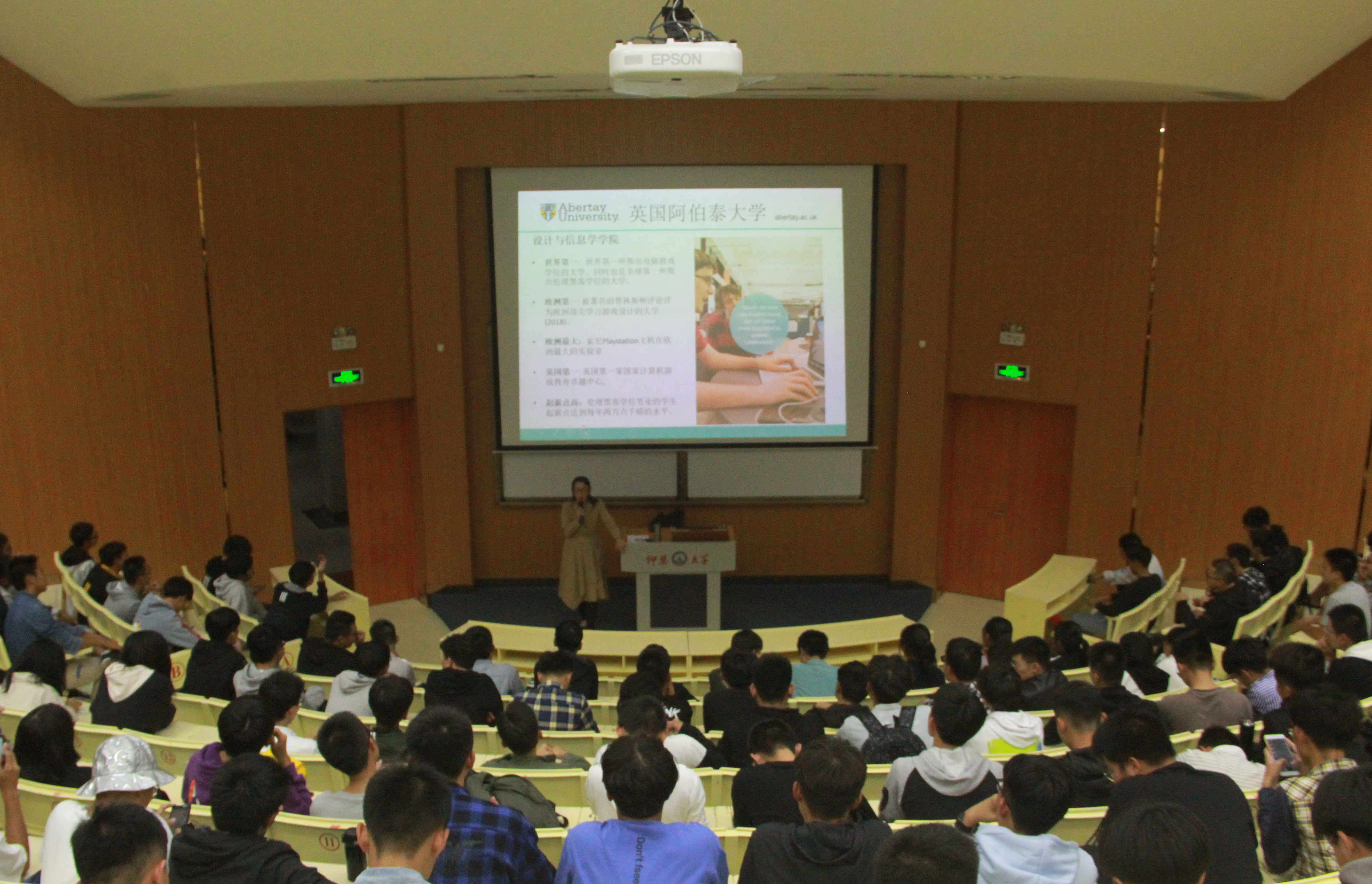 留学专项讲座上,李影院长分别从个人经历、阿伯泰大学教育教学特点,工程专业毕业生毕业优势、职业发展前景等方面做了宣讲。阿伯泰大学是英国唯一一所由官方授权开设电脑游戏技术和计算机艺术专业的学校。李院长从电脑游戏专业、道德黑客(网络安全)专业等与学生相关专业的、针对开设本科2+2(在我校两年,英国两年),3+1(在我校三年,英国一年)的本科阶段合作教育模式,和4+1(我校四年本科,+英国一年硕士)的合作方案、认证优势和留学基础要求做了重点介绍