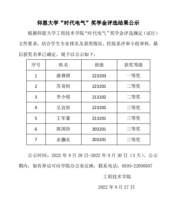 奖学金评选结果公示
