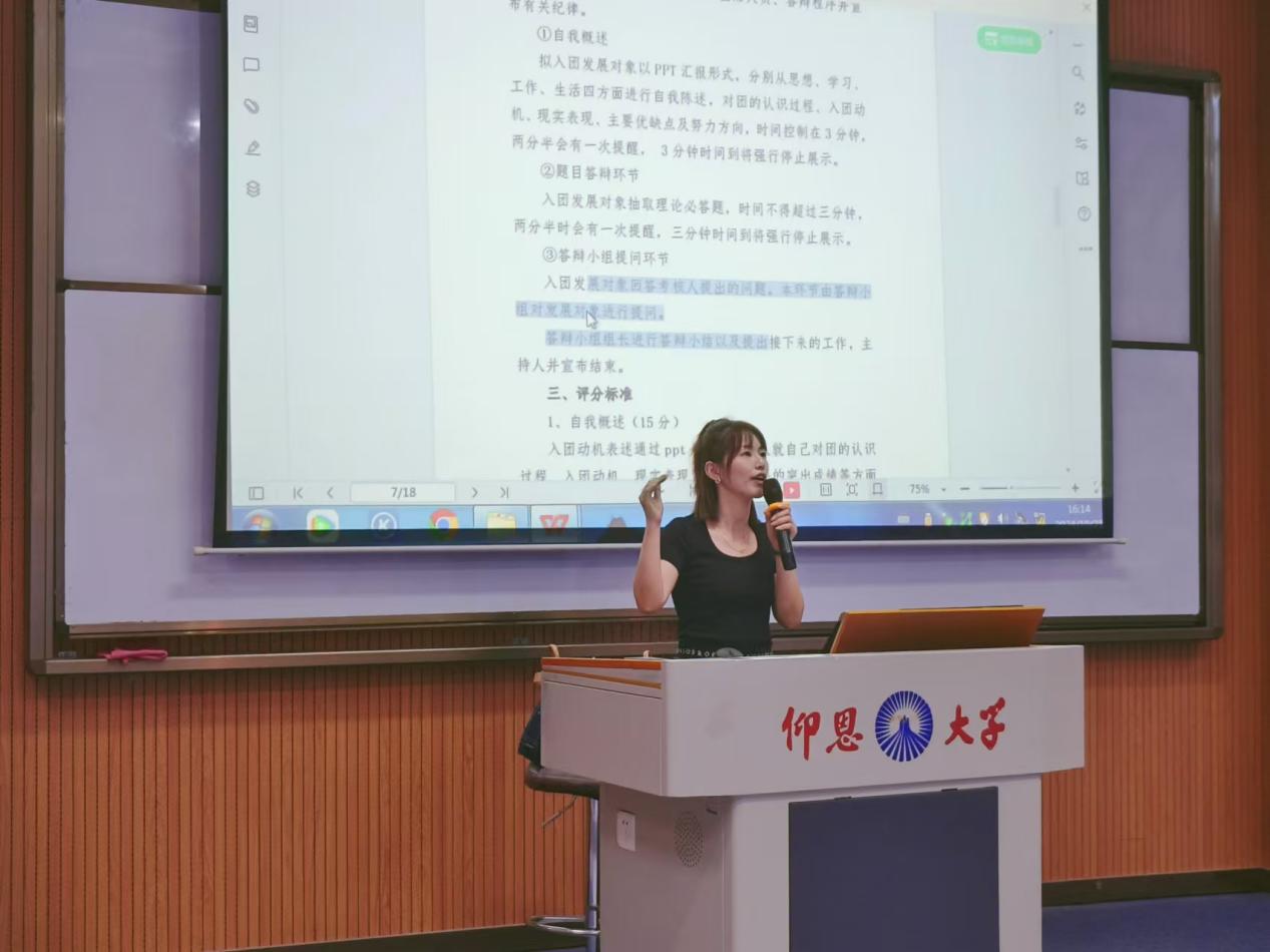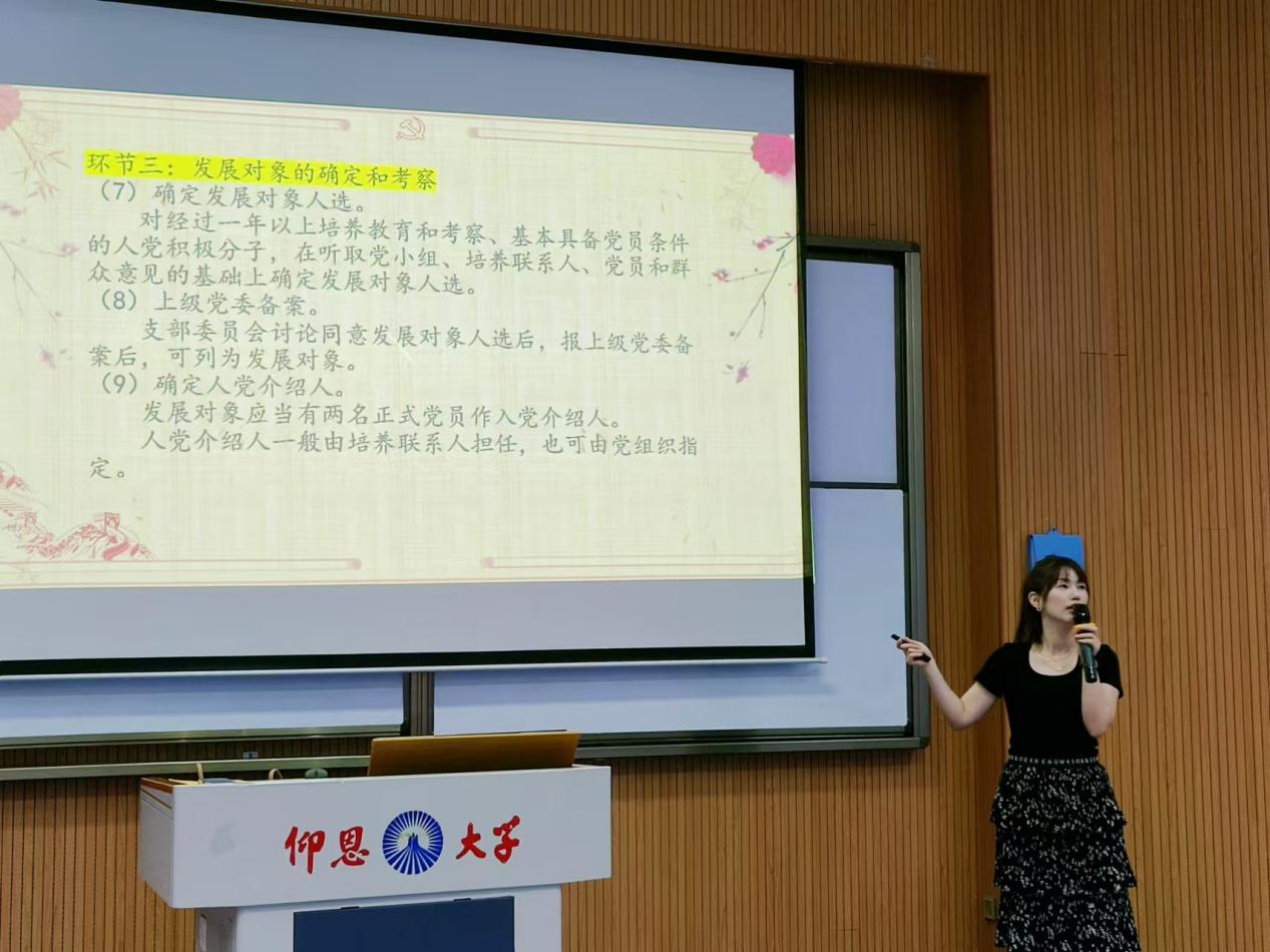随后陈思萍向新生详细介绍了入党发展流程、入党申请书填写注意事项以及拟发展答辩的具体说明,倡导新生积极入党,向党组织靠拢。