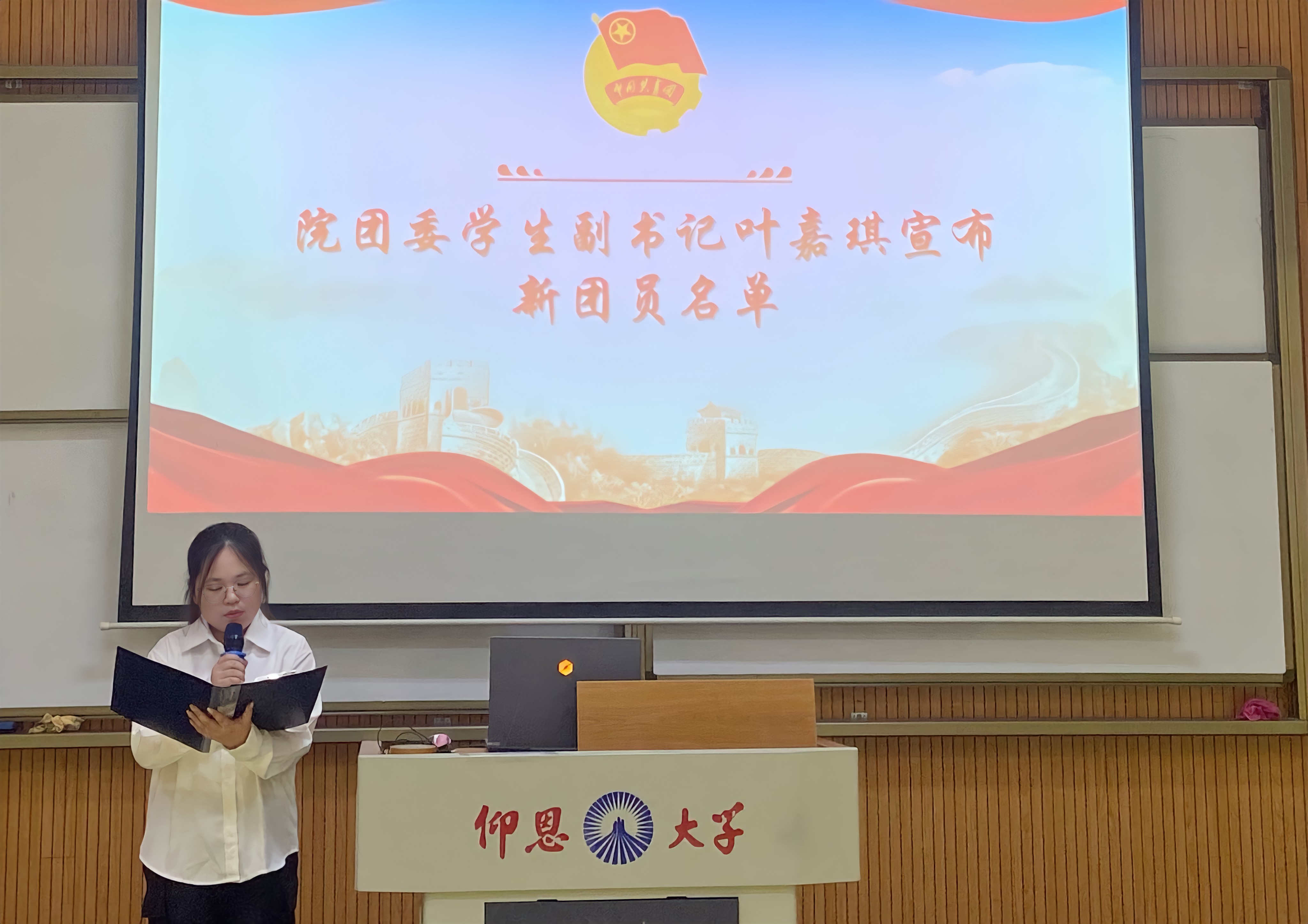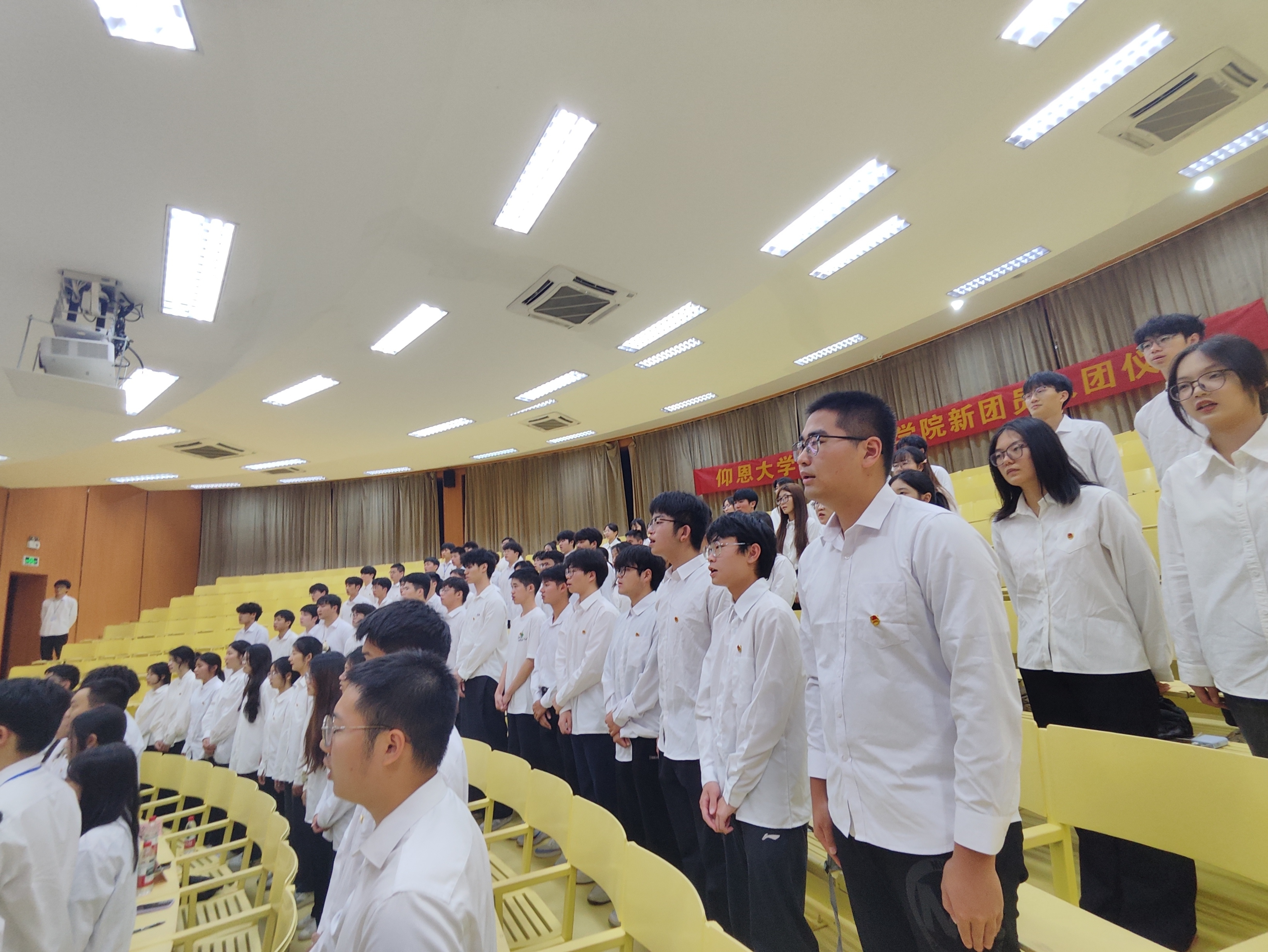院团委叶嘉琪同学说明入团仪式的意义并宣读新团员名单。随后,院团委老师为新团员代表佩戴团徽和颁发团章、团员证。颁发礼后,在院团委刘培莹同学的带领下,全体新团员面向团旗庄严宣誓,老团员重温入团誓词。入团介绍人代表林晓婷宣读了《团章》中有关团员义务和权利的条款,帮助新团员明确使命。