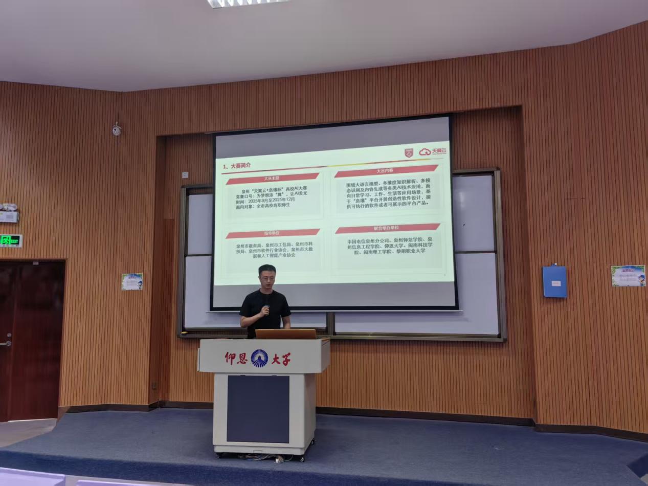 为深入推进“一站式”学生社区智育工作,助力学生精准把握人工智能领域的实践契机,2025年9月24日下午,由中国电信福建公司主办,taptap点点职引中心与宏船书院共同协办的“天翼云·息壤杯”高校AI大赛(福建泉州赛区)宣讲会,在博雅讲堂准时拉开帷幕。