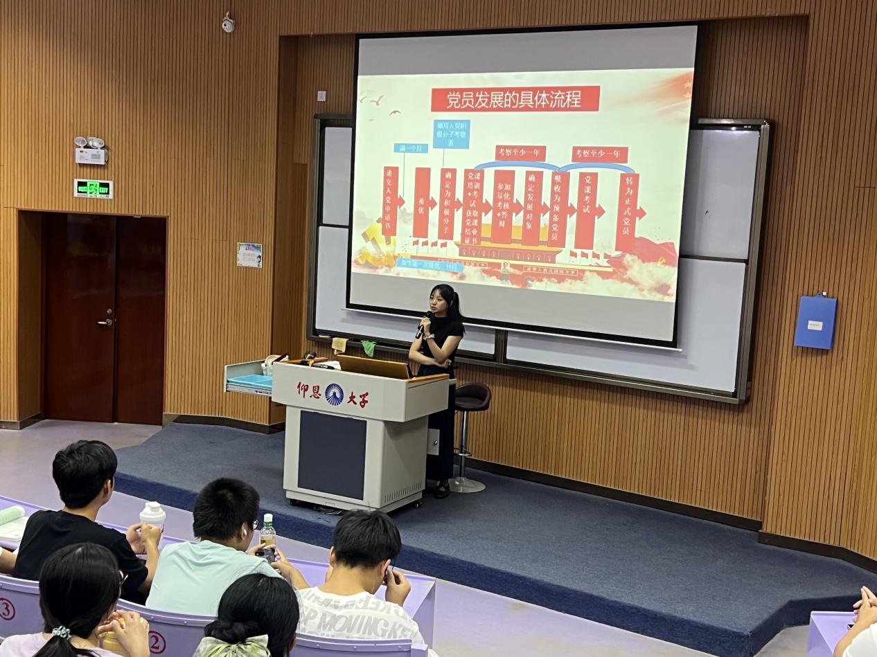 会上,庄秋荣对团员、党员的发展流程进行了详细介绍:递交书面申请-成为入党积极分子-确定发展对象-成为预备党员-转为正式党员。尤其对入党的条件和要求、入党申请书的书写和学院拟发展对象入党答辩评分细则的具体要求进行了强调,引导新生认识党的发展历程、端正入党动机。并鼓励同学们积极向党组织靠拢,认真学习马克思主义理论和中国特色社会主义理论,将爱国情怀落实到主动为同学服务的实际行动中,以高标准严格要求自己,勇于承担当代青年的历史与社会责任。