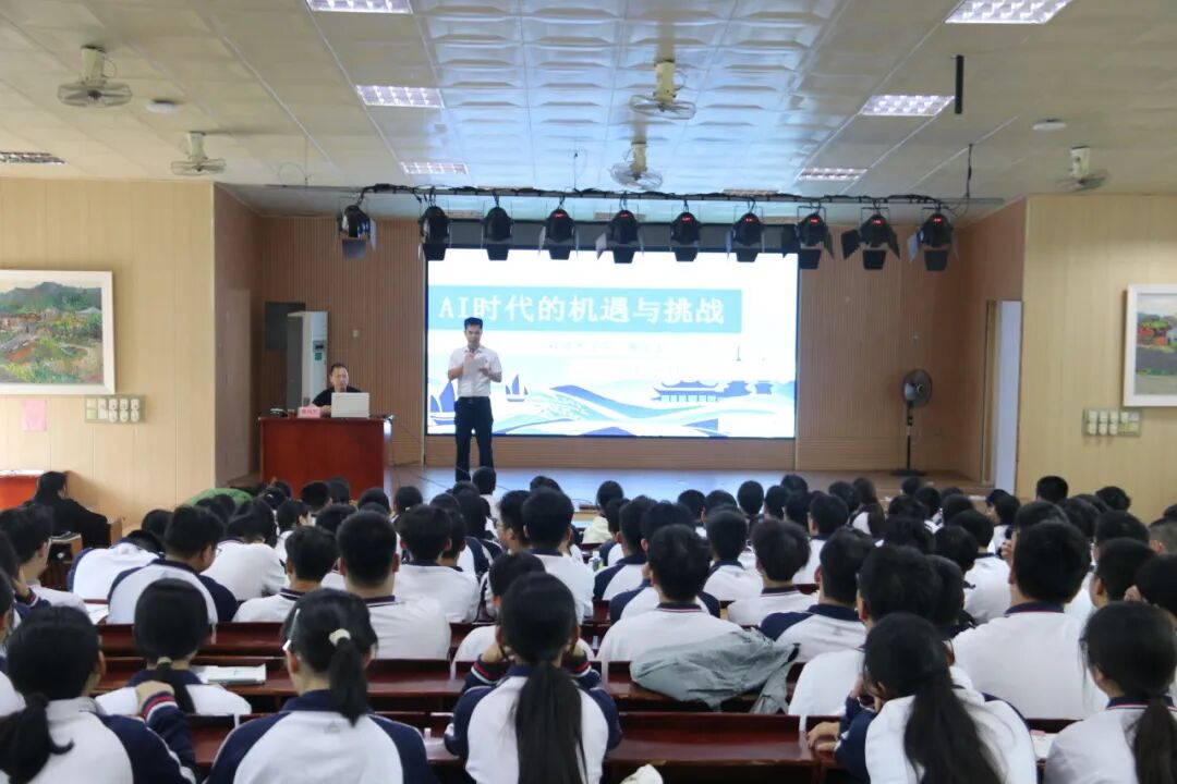 聘任仪式后,曾凤生副教授为奕聪中学高二年段师生带来了一场题为《AI时代的机遇与挑战》的科普讲座。讲座中,曾凤生副教授从最新科技动态切入,系统梳理了人工智能的发展脉络,生动阐述了前沿技术应用,并特别强调了科技伦理与社会责任,引导同学们在拥抱科技的同时树立正确的价值观。讲座深入浅出,互动热烈,极大地激发了中学生对科学技术的浓厚兴趣。