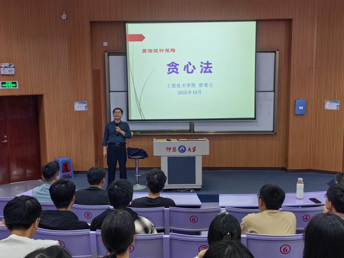 讲座中,郭观七教授结合自身科研与教学经验,从算法设计的工程实际需求切入,系统拆解贪心法的原理框架与核心设计逻辑。并指出,贪心法是解决最优化问题的经典启发式算法,其核心在于“通过局部最优选择逐步构造全局解”,尤其适用于资源分配、任务调度、路径规划等大数据与人工智能领域常见场景。每个案例均结合电网建设成本优化、计算机网络时延控制等工程场景,既清晰阐释贪心法“简单高效”的优势,也客观说明其“未满足最优子结构时可能仅得次优解”的局限,帮助学生建立“理论推导-实践应用-边界认知”的完整知识体系。