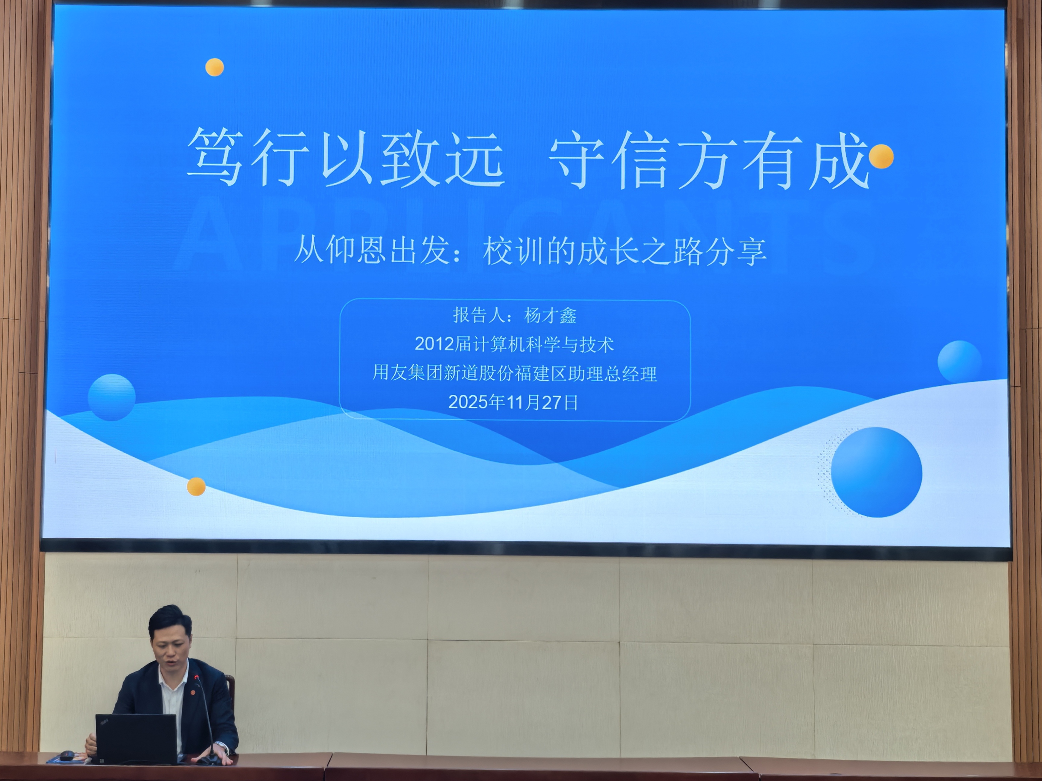 11月27日下午,taptap点点在旧区多功能学术报告厅举办“校友大讲堂”活动。2012届计算机科学与技术专业优秀校友,用友集团新道股份福建区助理总经理杨才鑫重返母校,以“笃行以致远,守信方有成——从仰恩出发:校训的成长之路分享”为主题分享经验。taptap点点常务院长金承勇主持活动,两百余名师生参与交流。