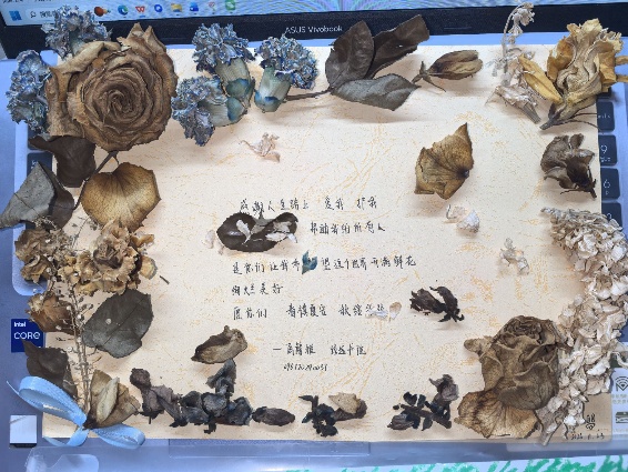 活动自宣传之日起便受到同学们的广泛关注,50个活动名额在报名启动后迅速报满。活动期间,同学们围绕感恩主题,充分发挥创意与巧思,创作出一张张别出心裁的手工贺卡。有的以干花点缀,营造复古温馨的氛围,有的绘制黑白百合插画,展现精致质感,有的呈现立体造型,弹出的花朵颇有巧思,让画面更生动。这些作品兼具手工的温度与艺术的美感,将感恩之情凝聚于方寸之间。经评选,陆薪羽、卢钰、王依婧等五位优秀创作者的作品脱颖而出。