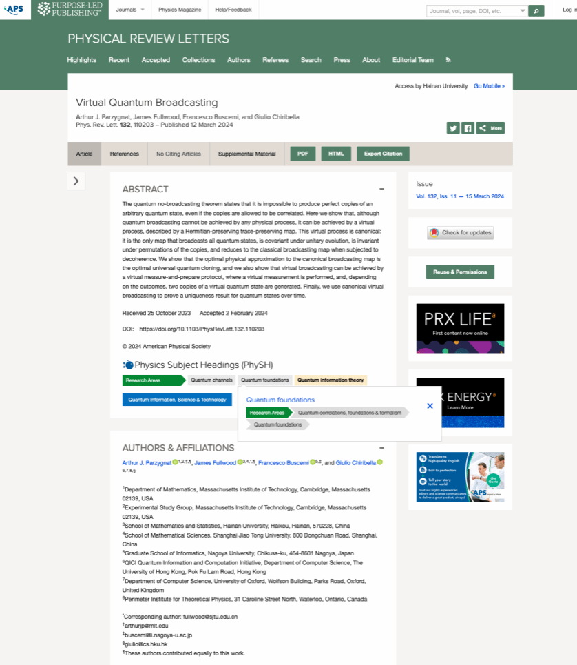近日,必赢3003no1线路检测中心教师James Fullwood以通讯作者及共同第一作者在权威期刊《PHYSICAL REVIEW LETTERS》合作发表了题为“Virtual Quantum Broadcasting”的学术论文。合作者为麻省理工学院Arthur J. Parzygnat教授、名古屋大学Francesco Buscemi教授和香港大学Giulio Chiribella教授。