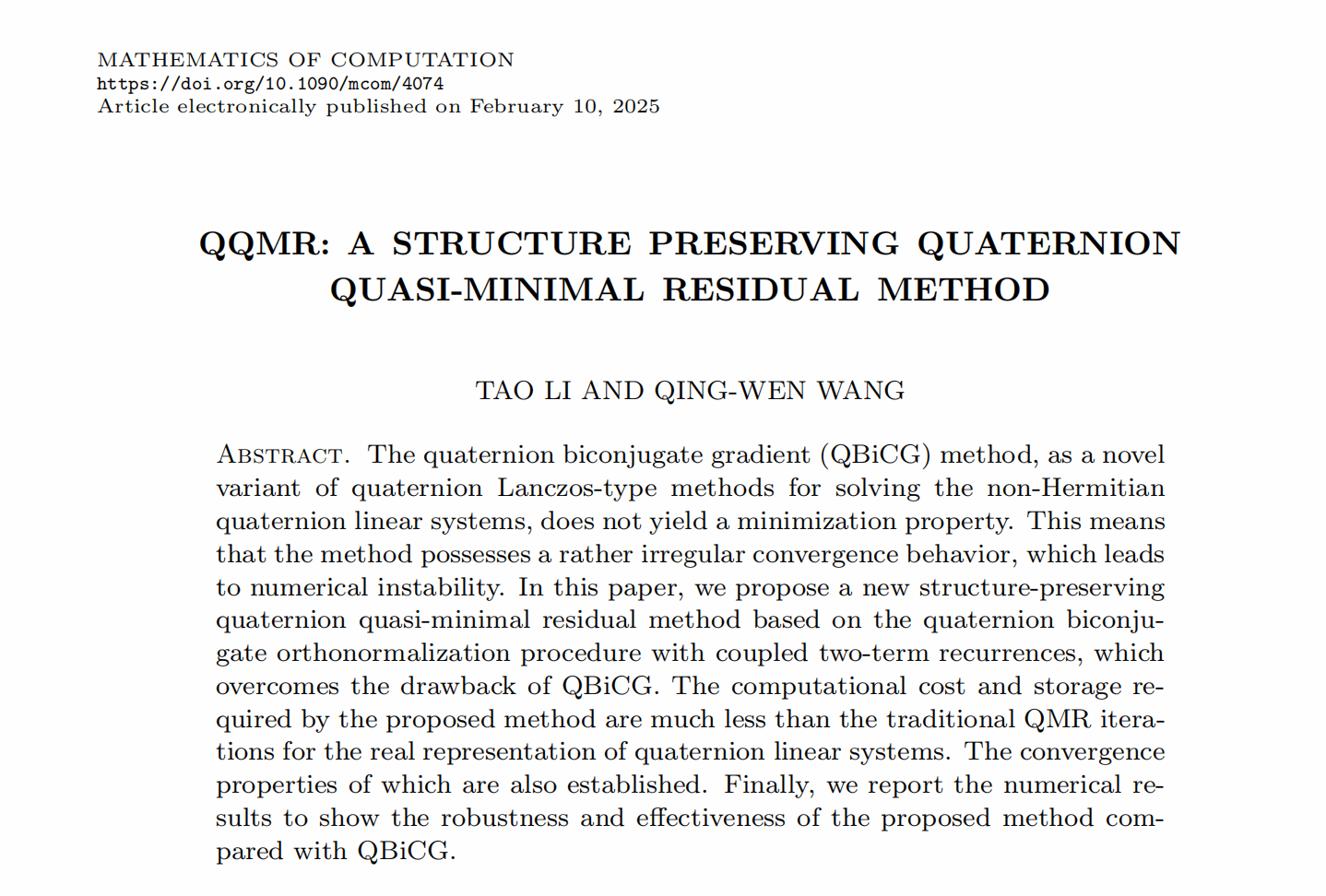 近日,美国数学学会期刊《Mathematics of Computation》在线发表了必赢3003no1线路检测中心李涛博士(第一作者)和王卿文教授的最新研究成果“QQMR: A structure preserving quaternion quasi-minimal residual method”。《Mathematics of Computation》是国际上计算数学领域的顶级期刊,由美国数学学会出版,创刊于1943年,专注于数值分析、计算方法和数学应用等领域的高质量研究。该期刊在学术界享有很高的声誉,发表的文章通常具有重要的理论或应用价值。在中国数学会推荐的数学期刊分类简表中被列为T1类刊物,在中科院分区中也是1区Top期刊。必赢3003no1线路检测中心为此成果的第一完成单位,通讯作者为上海大学王卿文教授。